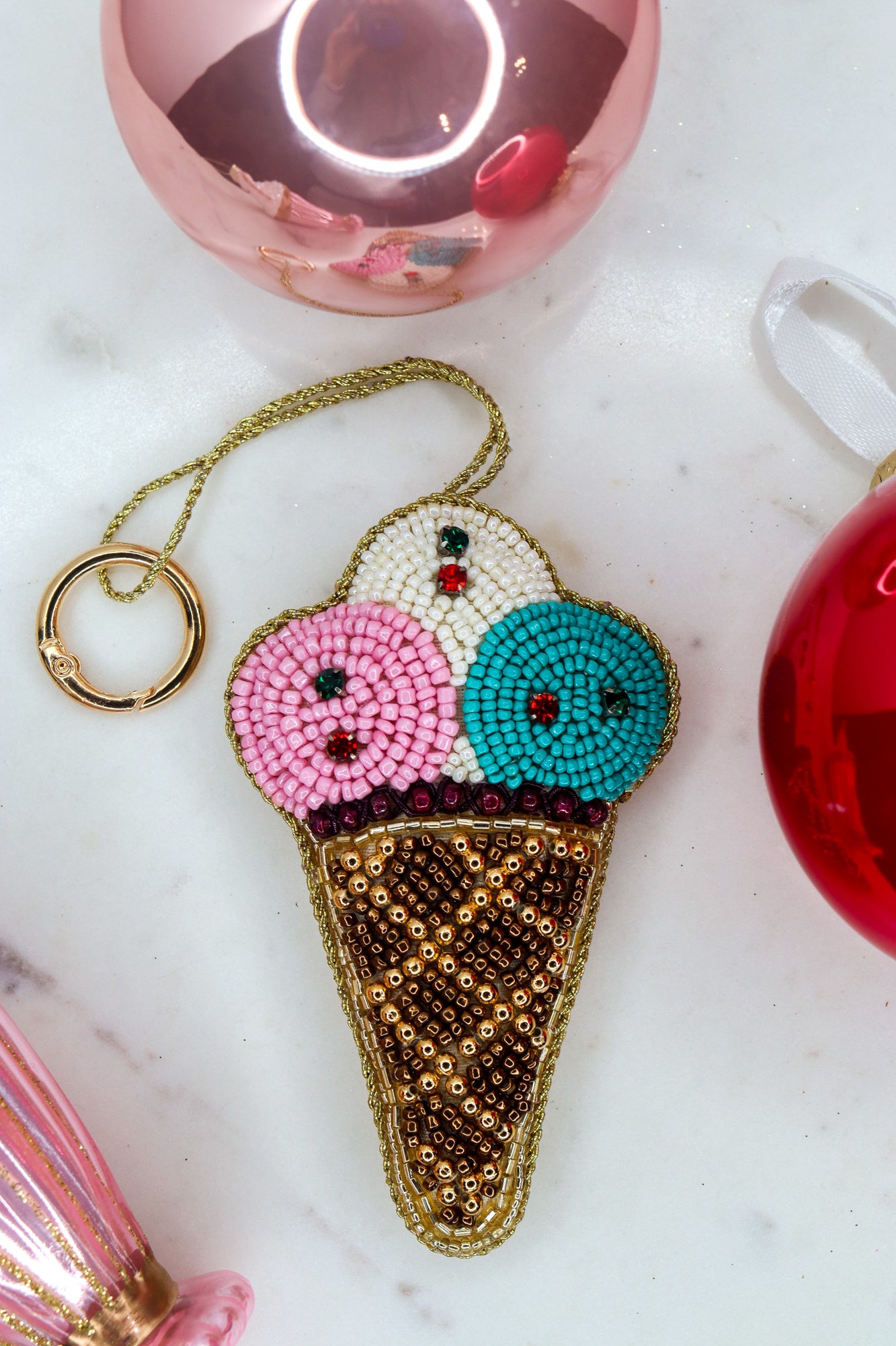 maxi pendenti imbottiti e realizzati in 3D, completamente ricoperti di perline di vetro cucite a mano, una ad una.