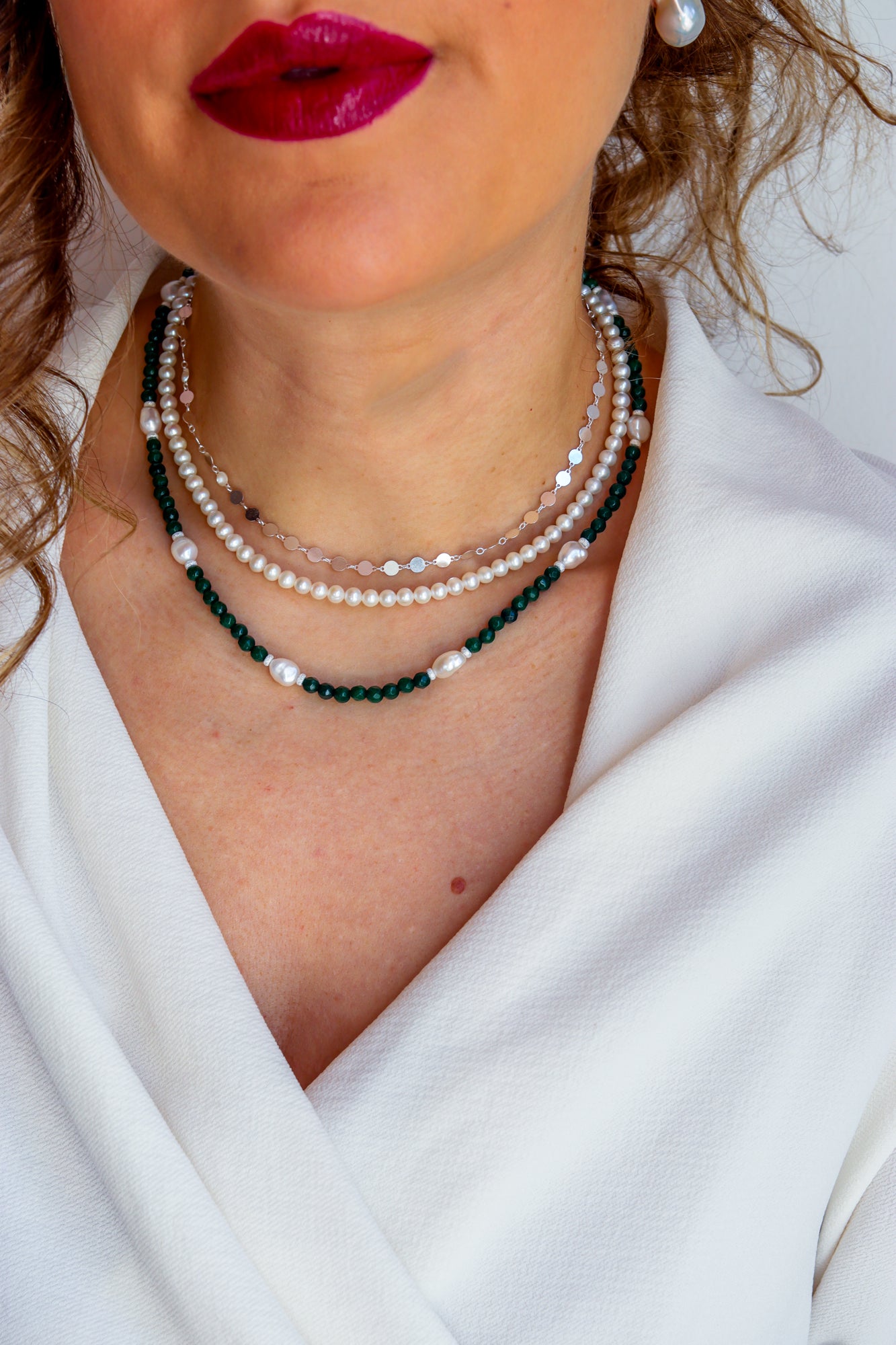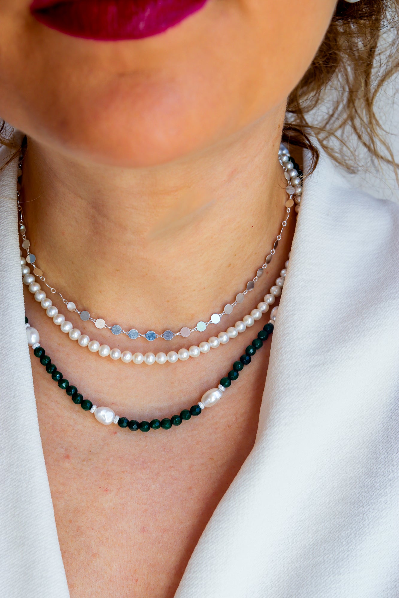 Fata del Bosco è la collana pensata per chi ama la delicatezza, ma non vuole rinunciare a un dettaglio che fa davvero la differenza. Un design minimal e leggero, costruito con pietre dure naturali e perle di fiume autentiche alternate: un equilibrio perfetto tra semplicità e preziosità.