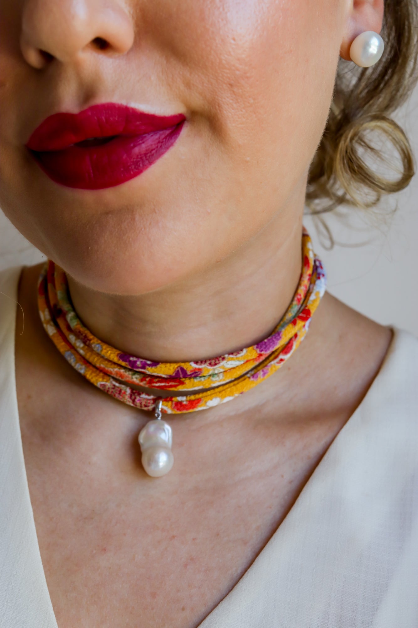 Scopri Fularino, la collana che unisce l’eleganza senza tempo delle perle barocche bianche autentiche alla leggerezza e ai colori della seta giapponese a fantasia. Ogni pendente, impreziosito da un gancio in argento 925 apribile, cattura la luce in mille riflessi unici, mentre il cordino in seta, ispirato ai tessuti dei kimoni, può essere annodato, raddoppiato o indossato come foulard intorno al collo, creando look sempre diversi.