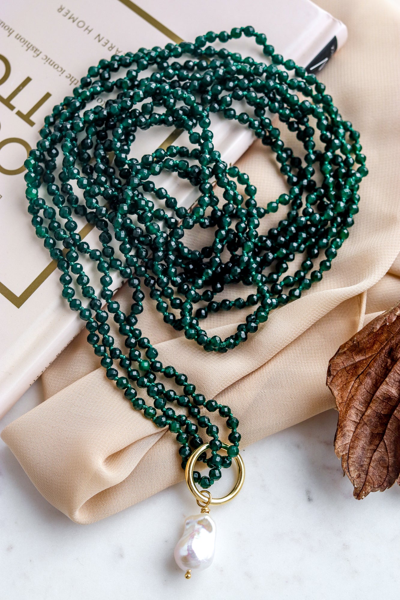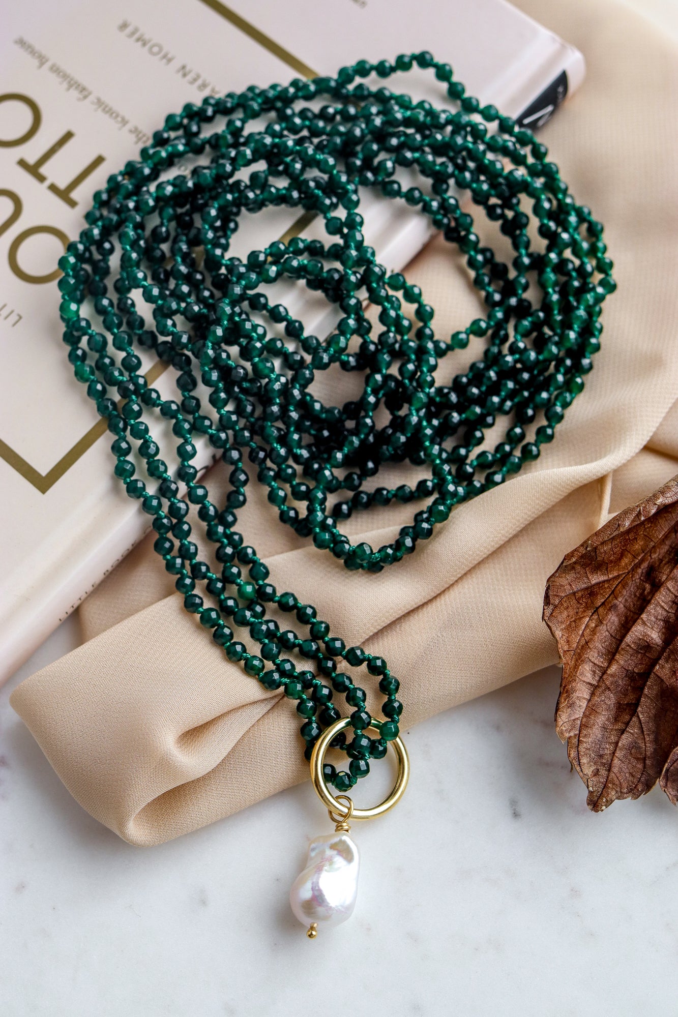 Perché la collana è composta da due fili lunghissimi (158 cm ognuno) di giada infilata a mano con tecnica nodini, e questo ti dà la possibilità di creare infinite collane diverse