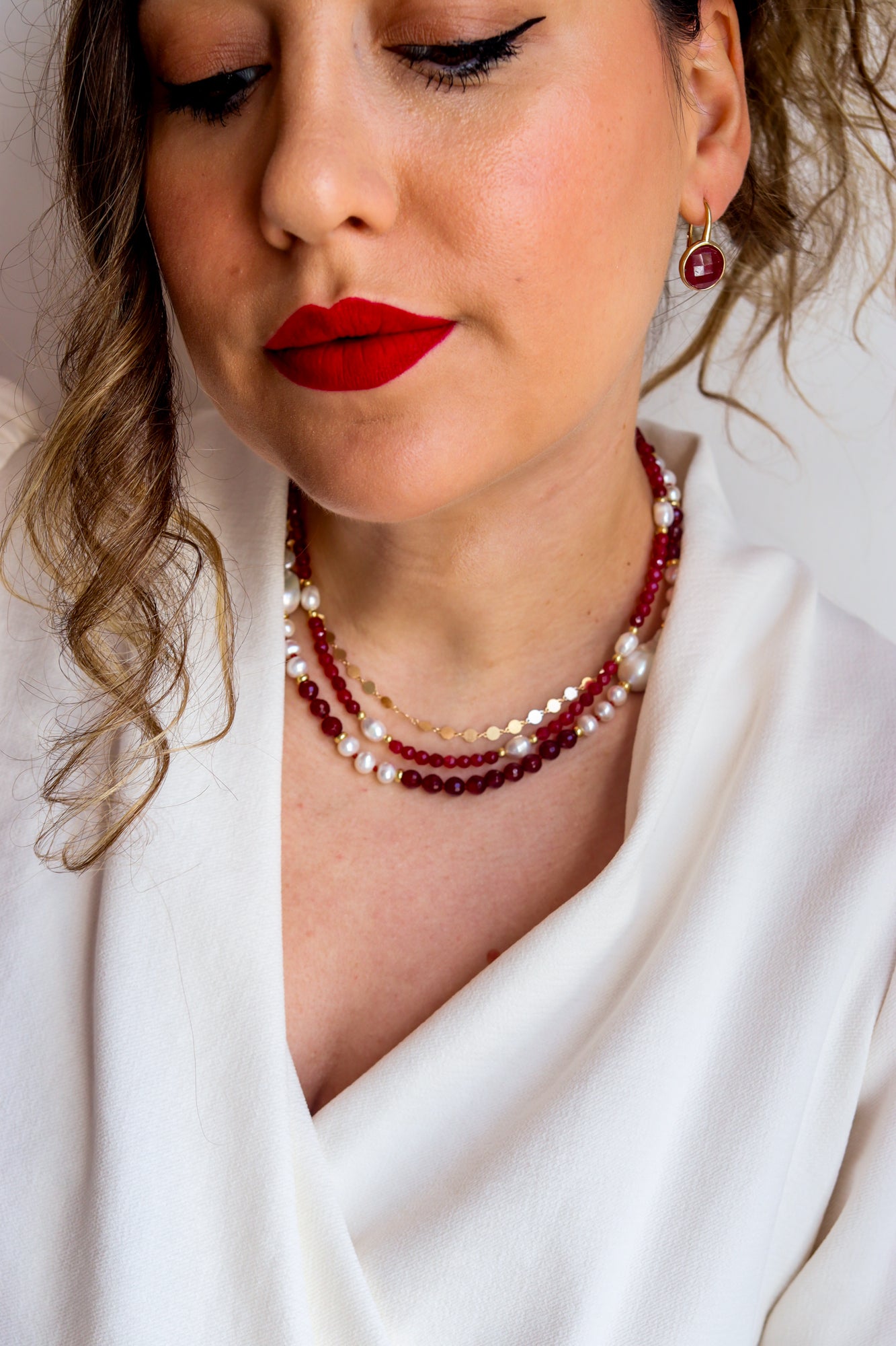 È anche splendida indossata da sola: una collana che veste, definisce e impreziosisce il décolleté con un’eleganza immediata.
