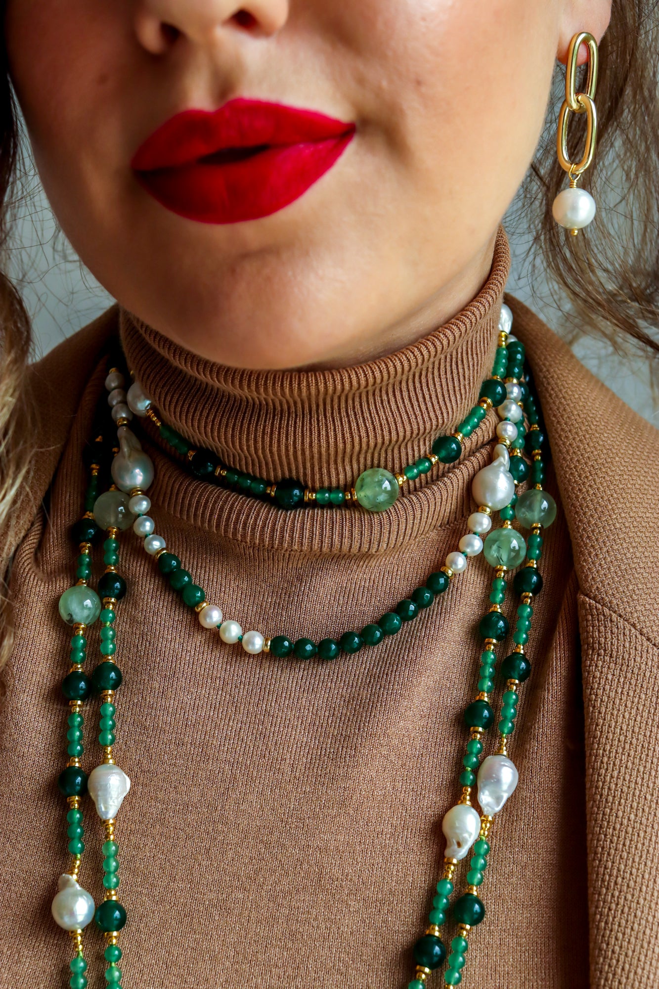 È un gioiello di grande impatto visivo, grazie alle sue perle barocche naturali, scelte per la loro forma importante, la luminosità unica e quel carattere irregolare che le rende vive, autentiche, preziose.