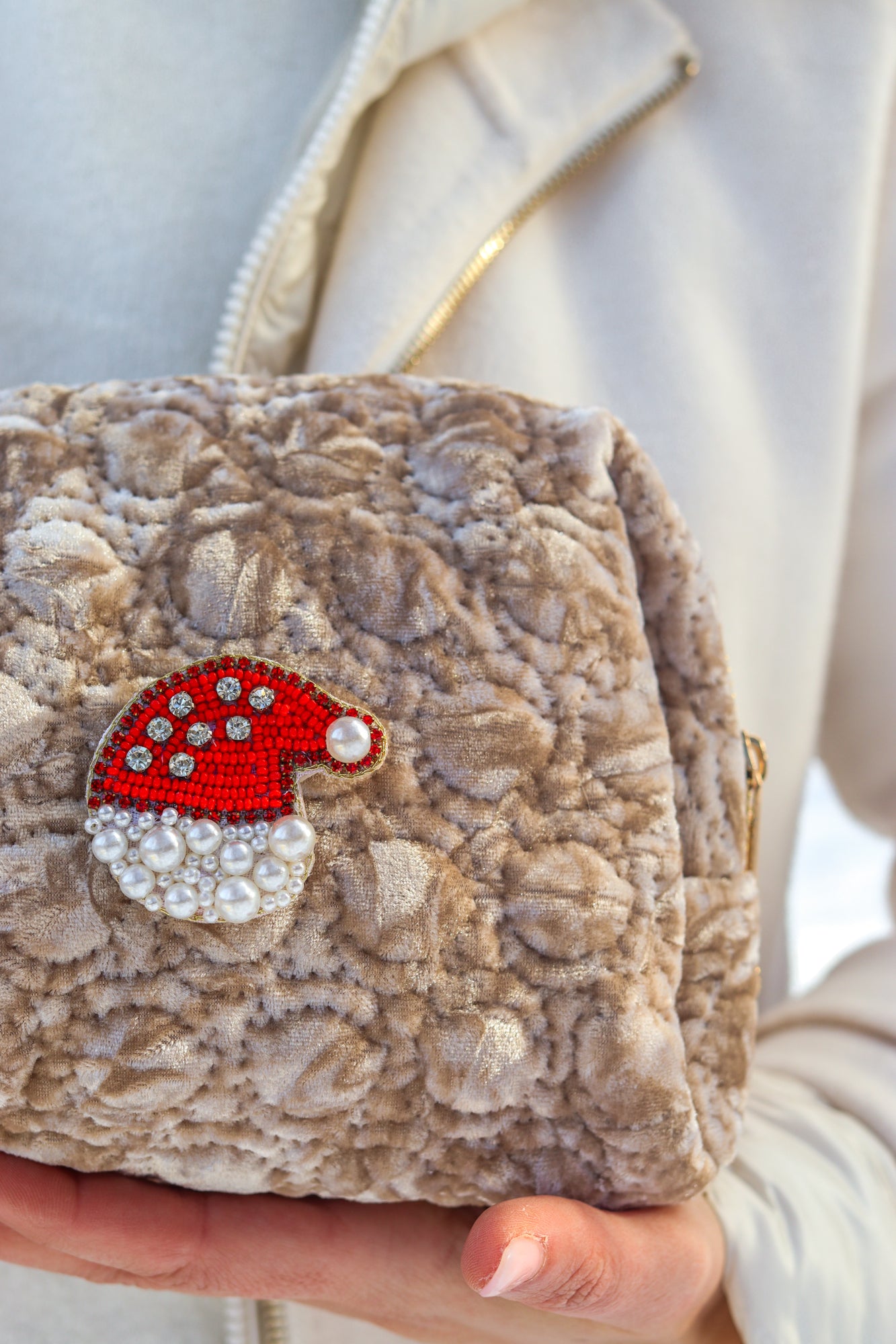 La spilla è removibile: puoi lasciarla sulla pochette per dare un tocco festoso al tuo accessorio, oppure staccarla e usarla in mille modi diversi. Sta benissimo su maglioni morbidi, sciarpe avvolgenti, cappotti, cappellini di lana, giacche e cardigan. In un attimo cambi volto al tuo outfit… o alla tua borsa.