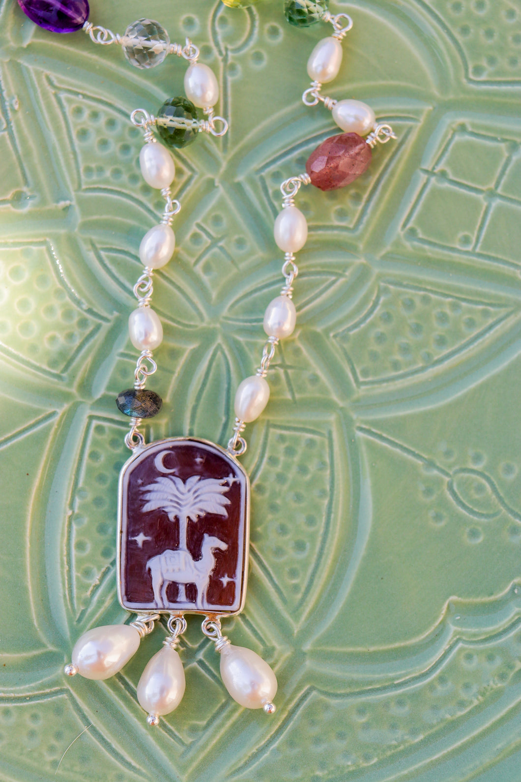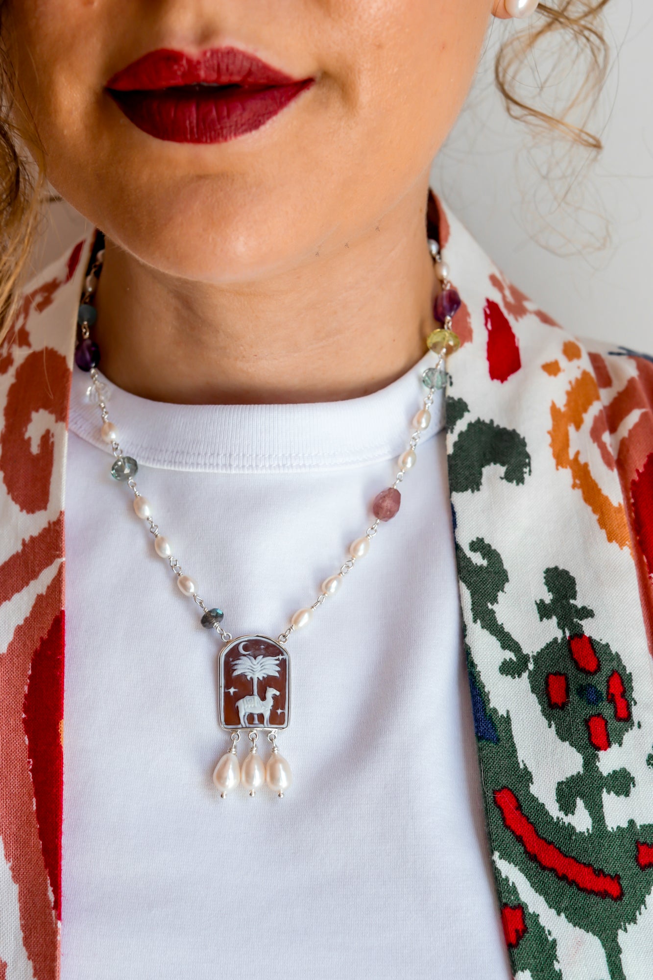 Una collana che unisce l'eleganza delle perle con la ricercatezza di un cammeo unico, sia per il disegno originale Melania Gorini Gioielli, sia per la forma così particolare.